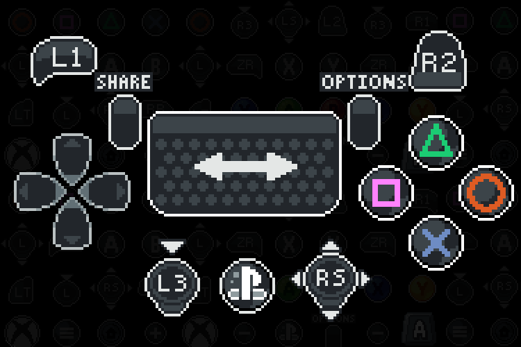 A collection of pixel art buttons from keyboard and the most commonly used gamepads.